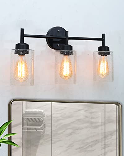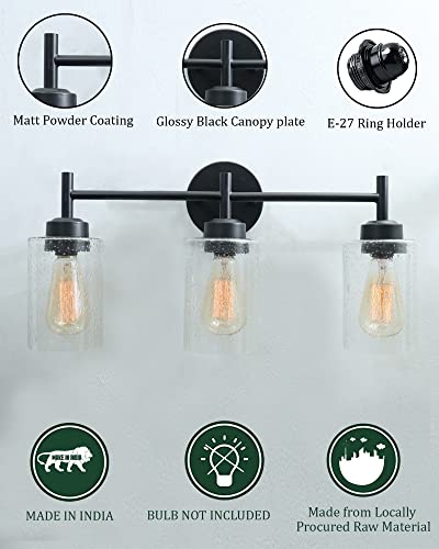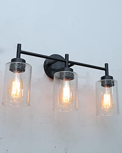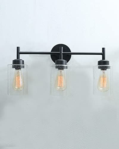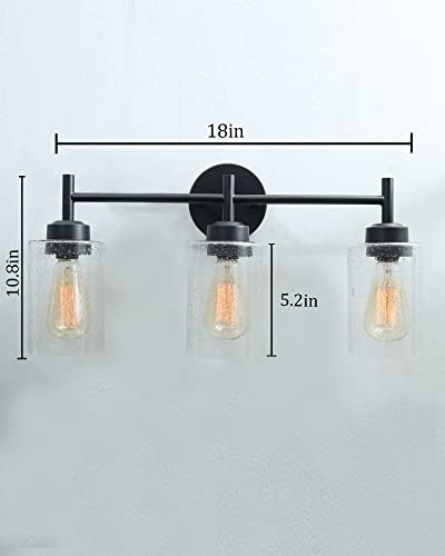 This wall light ideal for striking a balance between strength and elegant beauty. Metal Black tone finish 3 light bathroom vanity light offer a touch of rustic elegance, classic clear Bubbled seeded glass shades allow light to shine brightly through. The design of this bathroom light gives it a pared-down craftsman look. A minimalist finish and shade add low-key style over a kitchen sink or bathroom mirror. The 3 light wall fixture is perfect for your home decoration, idea for top side of a mirror or bed, a doorway or entryway, lining an office or hotel hallway, or under a covered porch or patio, This farmhouse bathroom lighting fixtures has complete accessories and simple structure. just need to connect the wire and assemble the shade only.