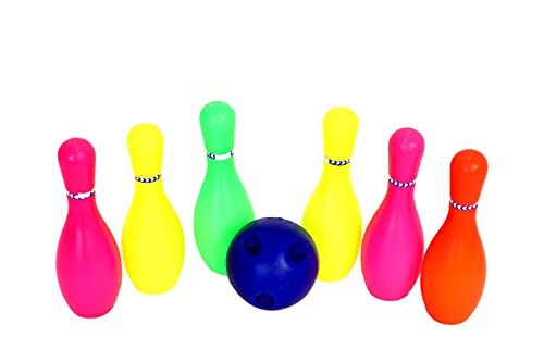Easy to play bowling set comes with easy-insert finger holes for better grip and throw.- bowling set kids, bowling finger gripsBright and colorful bowling set. Pin Height 16 cm.