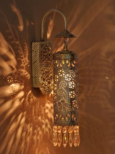 Designer wall mounted lamp with crystals hanging which gives a twinkling look to your living area and outdoors. Its old classic look making it ideal for achieving that older feel to your room.
