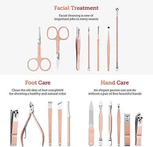 PROFESSIONAL -Manicure Kit contain 18 pieces of nail and toenail tools. It can satisfy almost all of your facial, hand and foot care,manicuring,pedicuring,Ear picking,eyebrow shaping, anti-acne, exfoliating Etc. It is perfect for all types of nails and trims, including women,men,girls,boys and seniors.